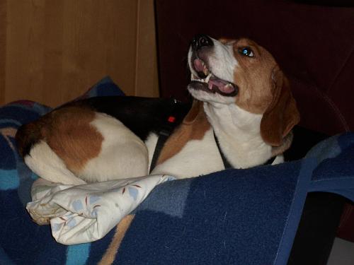 Mein Körbchen! Hier sind meine 0,5 Quadratmeter! Die darf mir kein anderer Hund wegnehmen! (Verratet es aber bitte nicht, in der hellen Decke habe ich meine Leckerli vergraben.)