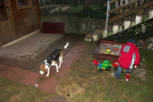 Auch die Kinder spielen fröhlich im Regenwetter im Garten.